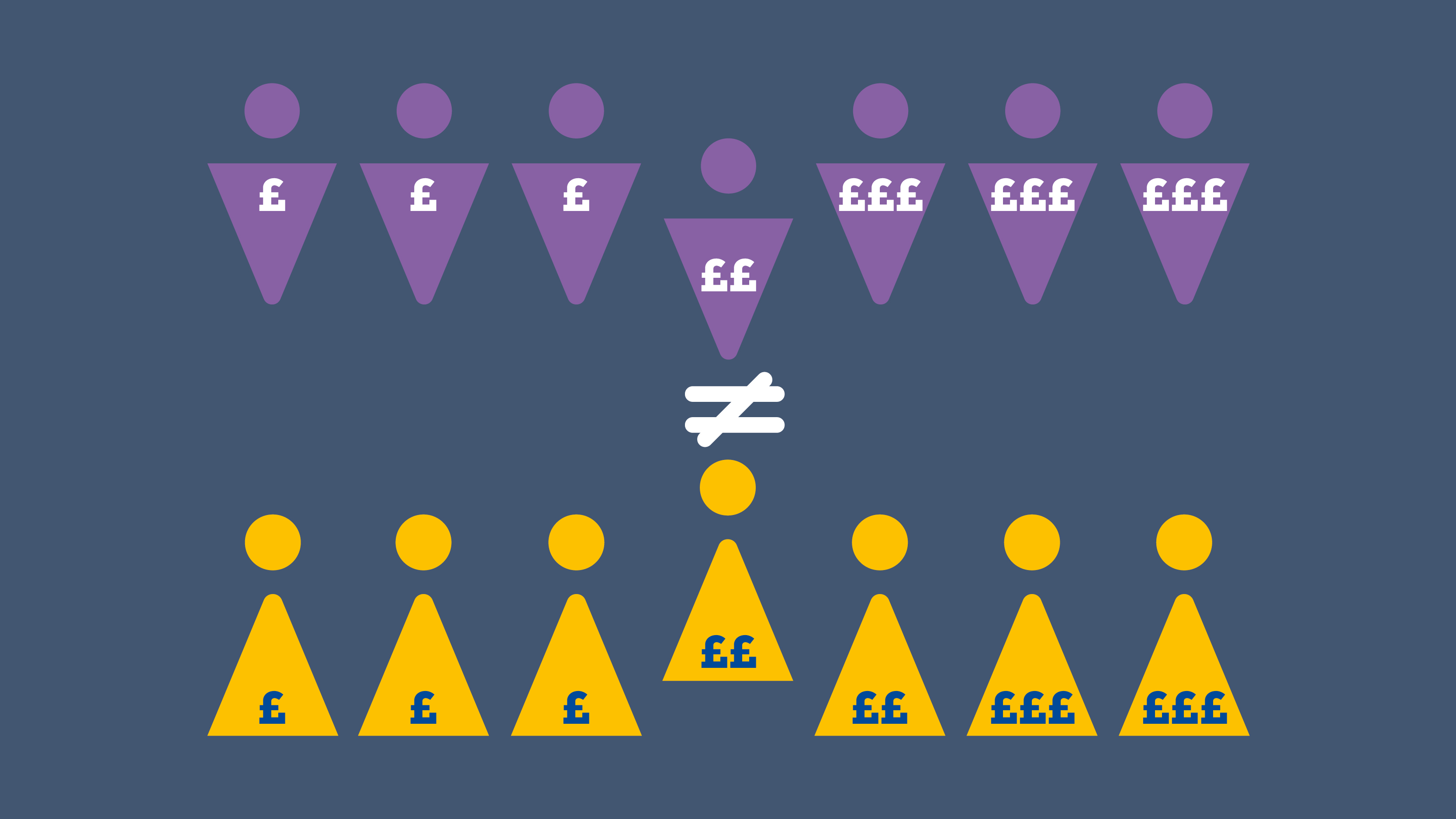 The gender pay gap is different to equal pay. Equal pay relates to men and women receiving equal pay for equal work. The gender pay gap is concerned with differences in the average earnings of men and women, regardless of role or seniority.