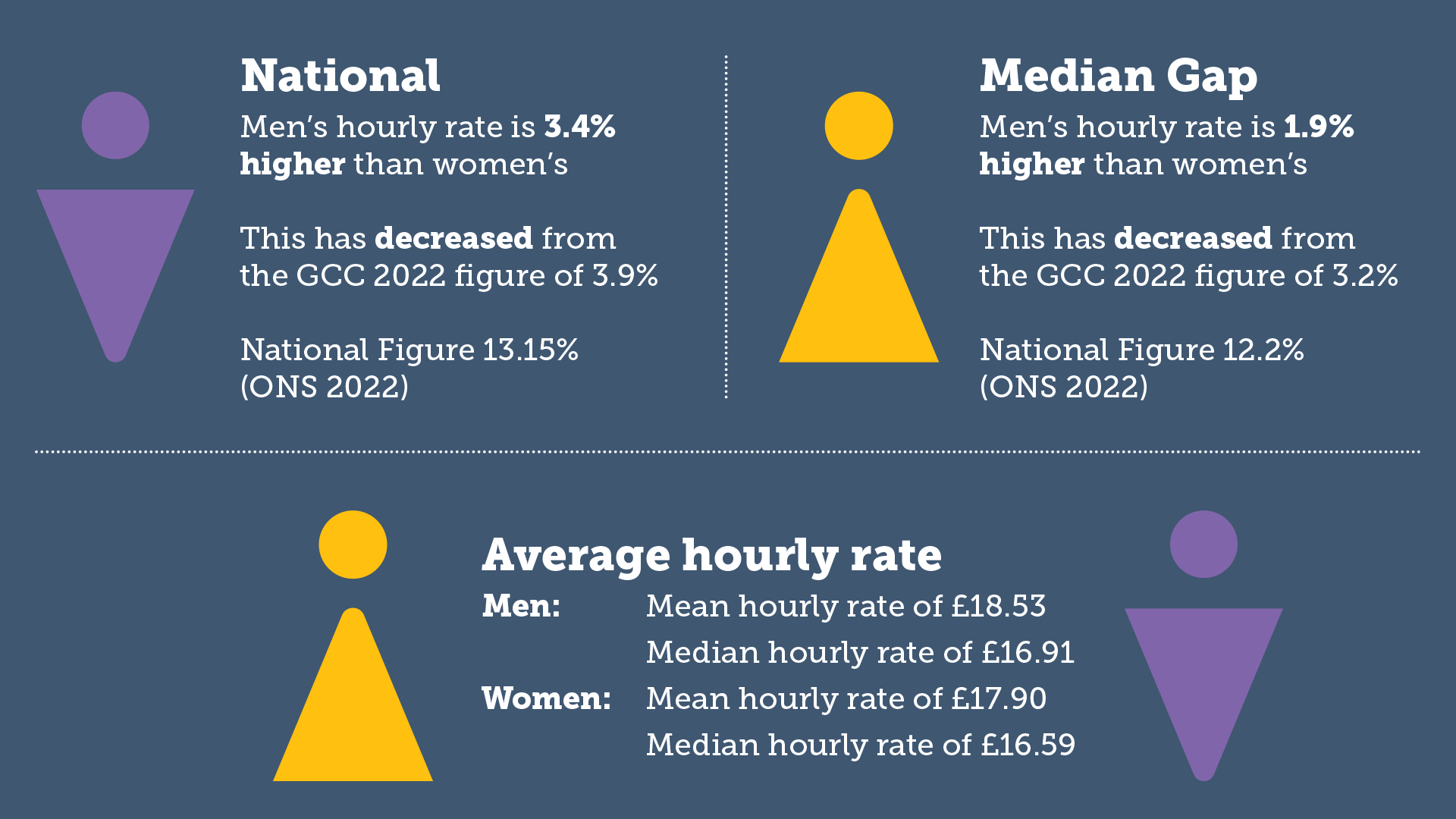 In September 2019 GCC conducted a review into Local Government Service ‘Green Book’ pay and grading structure. An interim calculation (as at 31st October 2019) of GPG following implementation of the changes showed, as a result of the review, GCC mean GPG reduced from 7.3% to 5.6% and GCC median GPG reduced by from 12.7% to 7.3%. Annual snapshot figures as at 31st March for years 2020 to 2023 show further reductions, and the gap has continued to reduce as at 31 March 2024.