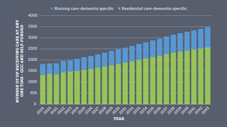 Assuming that the need for bed-based care will be comparable for older people at the same age in 2023 and 2043, we are projecting a 97% growth in overall bed-based demand for this cohort in the next 20 years, with 4,058 older people in need of residential beds (84% increase) and 3,116 needing nursing beds(122% increase) by 2043.