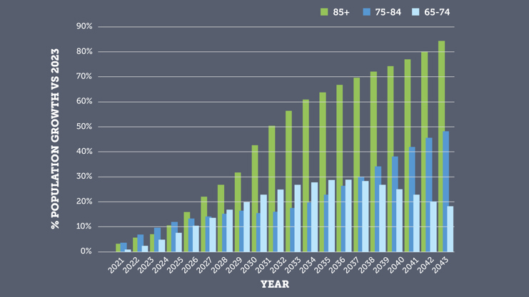 Figure 8: Percentage of population growth by age group for those aged over 65 years between 2023-2043
