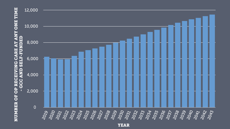 Figure 6: Estimated total numbers of older people receiving care (GCC-funded and privately funded) 2019-2043