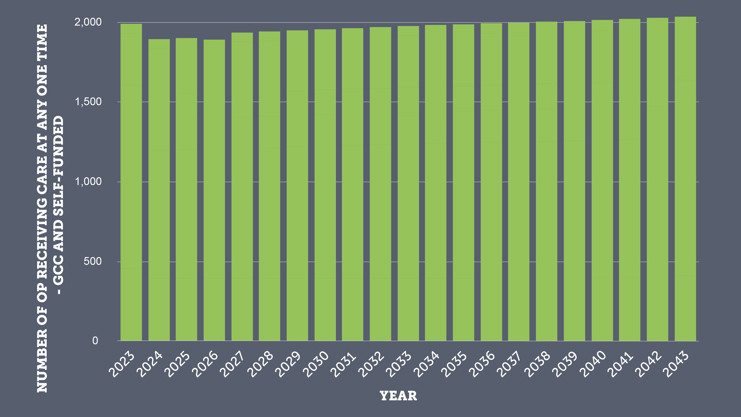 Figure 6: Estimated total numbers of adults of working age receiving care (GCC-funded and privately funded) 2023-2043