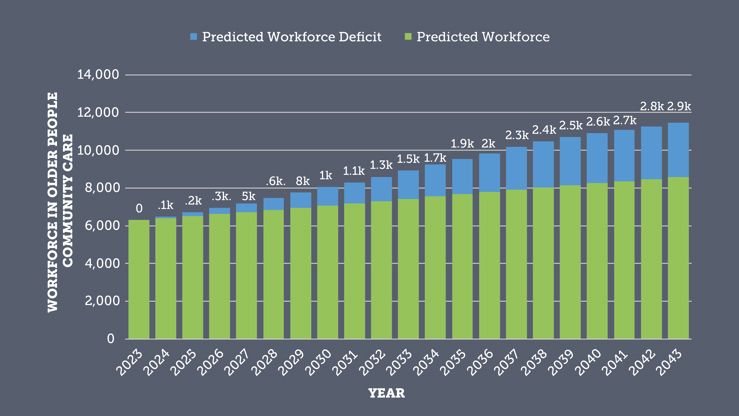 Over the course of the next 20 years, the community-based care workforce for older people in Gloucestershire is projected to grow from about 6,300 to over 8,500 people. However, this will not be sufficient to meet the predicted increase in demand. As the shortfall in community care workers grows, there may be an increasing number of people who are not receiving the type of care they need.