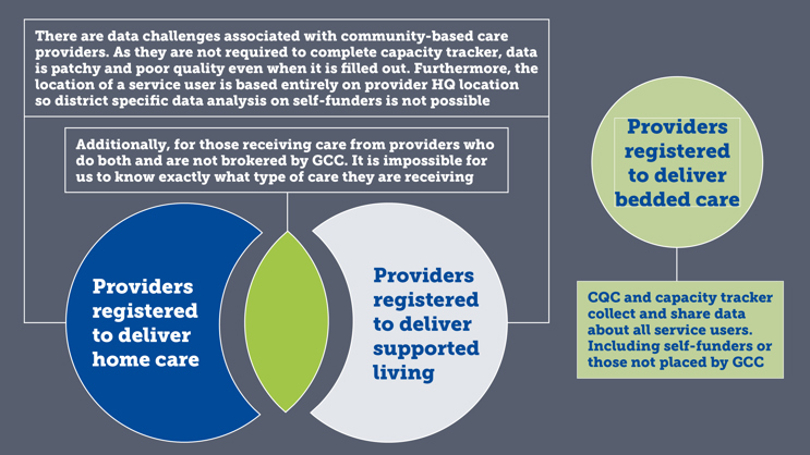A large contributing factor to this is the inaccuracy of capacity tracker responses by community providers. For example, of 15,000 hours reported available, 8,000 were from just four providers. Additionally, where providers are dual registered to provide multiple different community services, we have no way of telling what service that provider is providing to self-funders or those placed in Gloucestershire from out of county.