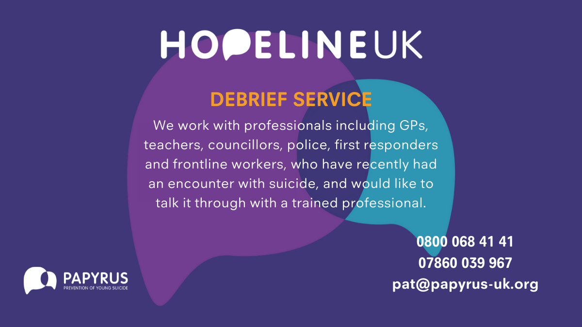 PAPYRUS offers a debriefing service for those who are supporting others (GPs, teachers, first responders, frontline workers, volunteers etc.) who have had an encounter with suicide and would like to talk it through with a trained professional. To access this support, contact the HOPELINEUK service via telephone: 0800 068 4141, email: pat@papyrus-uk.org or text: 07860 039 967.