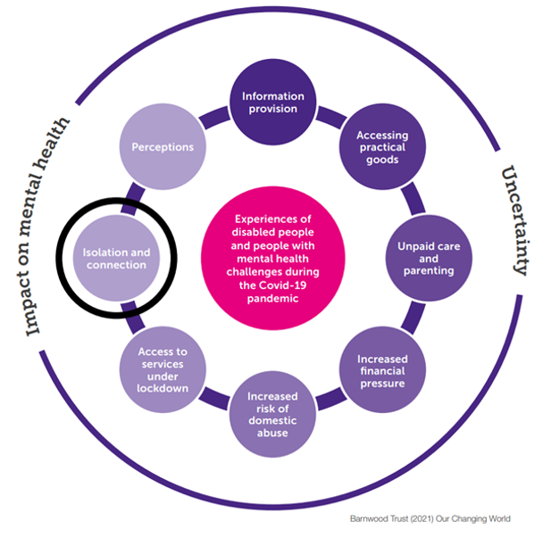 Locally charity, ‘The Barnwood Trust’ published a report in 2021 entitled ‘Our Changing World’. This report explored the experiences of people in Gloucestershire with disabilities during the earlier periods of the pandemic, clearly identifying that isolation was exacerbated as relationships that were relied on to help manage day to day were restricted or altered.[iii]