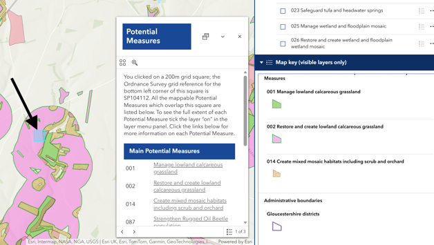 This allows you to then turn on the specific layers that are relevant for that area. This image shows that in the area selected (blue square), there are measures for managing calcareous grassland, restoring and creating calcareous grassland, and creating mixed mosaic habitats. The key on the right hand side shows the "symbology" or colour/pattern used for each layer.