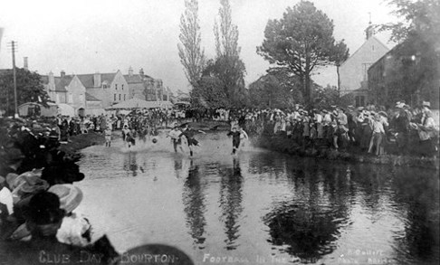 Little is known about the history or origins of this football match other than it began around 1900 – possibly as a fund-raiser for the Bourton-on-the-Water Football Club. This photograph was taken in 1902. The games is played every August Bank Holiday as part of the village fete between two 5-a-side teams, one from the club’s 1st XI and one from the 2nd XI teams. The game is 15 minutes each way with no rules apart from that if the goals (which are anchored in the river are moved or collapsed) penalties are awarded. It attracts large crows who often get wet. The riverbed through the village is Cotswold gravel, so there is little in the way of obstacles.