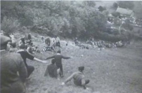 Cheese rolling is an annual race held at Cooper's Hill, near Brockworth that involves people chasing a 6-8lb/3-4Kg Double Gloucester cheese down the 45-degree 200-yard-long hill. At the bottom, the cheese is travelling at around 80mph. The first written evidence of the custom is in a note sent to the Gloucester town crier in 1826, but even then, it was thought to be at least six hundred years old. However, no-one really knows how or why it started but one current view is that it is linked to a village celebration – also known as a ’wake’ – possibly linked to reinforcing common laws surrounding grazing on the nearby common. The term wake comes from the church. Every church at its consecration received the name of a patron saint, whose feast-day or festival subsequently became the festival day of that church. However, the day on which the church was dedicated was also celebrated as the feast day of the parish. These two events ran until the Reformation, after which the dedication day (known as ‘the church's holiday) was ordered to be kept, while the saint’s festival was dropped. The dedication day is kept in many places today. Originally every feast day or festival had two components: the vigil or eve of the feast (commencing on Saturday at sunset), while from midnight on the Sunday, it was known as the wæccan or wake. After the church services had finished on the Sunday, parishioners would start celebrating with food and drink. However, such celebrations – both for the Saint’s Day and Church holiday – soon began to be abused (even in the church services, many people started drinking). As a result, many wakes were suppressed by the Puritans, but morphed into commercial markets, which became fairs – often located close to the parish or town church.