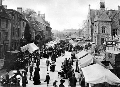 Fairs are a gathering of people for a variety of entertainment or commercial activities – this is Stow Fair c1900. They were often held on religious festivals and the right to hold a fair was usually granted by royal charter and they had pye powder courts to judge offenses and disputes. As the trading element of fairs declined, entertainment grew and by the 1900s most fairs were fun fairs - all about fun rides, stalls, and food. Hiring fairs, also called statute or mop fairs, were regular events where labourers (often with the tools of their trade) were hired for fixed terms. They arose from Edward III’s attempt to regulate the labour market by the Statute of Labourers in 1351 after the Black Death. Typically, they would take over a town centre for two days and workers of both sexes would gather in order to bargain with employers to secure a position for the coming year. The yearly hiring included board and lodging for single employees for the year with wages being paid at the end of the year’s service. These fairs attracted all the other trappings of a fair and attracted poor reputations for the drunkenness and immorality involved. Today mop fairs have morphed into fun fairs with fast, brightly lit and very noisy entertainments including traditional rides such as carousels and helter-skelters.