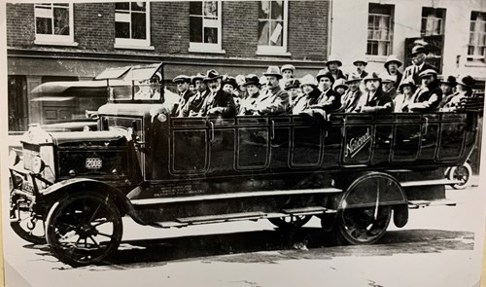Before the evolution of the dreaded ‘team building days’ so beloved of HR (human resources) and middle management, works outings used to be considered a fun treat with employers laying on day trips for their staff. These usually included a journey to somewhere other than the place of work, food and drink. This is a National Omnibus and Transport Co. Ltd charabanc in London Road, Stroud, which appears to be on just such a trip. The name charabanc comes from the French char à bancs (“wagon with benches”) and they were long, four-wheeled vehicles with several rows of side-entry forward-facing seats that made them ideal for taking parties of people to one destination.