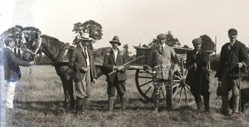 This is a posed photograph of a shooting party at Foxcote, Ilmington. There were three types of shooting practiced for recreational entertainment: target shooting on ranges, rough shooting on farms or open country (including poaching) and organised driven shoots on estates, aka ‘Shooting Parties’. The former typically used pistols or rifles while the latter pair usually involved using shotguns for game – either games birds or rabbits. Shooting on estates could account for enormous quantities of game in any single year – Tibberton Estate outside Gloucester was typical. It held around 5 shoots a year with an average of five invited guns. For the year 1925-26 the game killed on the estate on the included 70 partridge, 90 pheasants, 2 woodcock, 4 hares, 816 rabbits, 13 wood pigeons, 2 moorhens and a water-rail. Most large shoots relied on ‘beaters’ to drive game towards the guns – this was a popular pastime for local male agricultural labourers who were rewarded with a hearty lunch and on the larger shoots some of the killed game to take home for the pot. Shooting parties for the upper classes reached their zenith prior to WW1, after which due to lack of shooters and beaters many estate shoots died out.