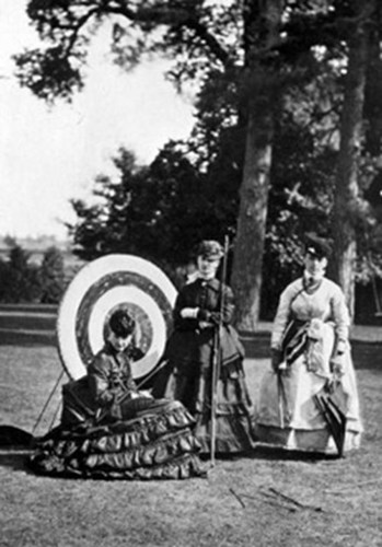 Archery was a widespread aristocratic sport, which had been revived during the romantic period and was felt suitable for both women and men. Photographed in 1870, this is Mrs J R Yorke, Mdm. de Brienen and Mrs Langhorne practicing archery in the gardens of Forthampton Court. Given the restrictions on movement caused by the volume of material in dresses and petticoats and (no doubt), the formidable corsets underneath, archery was one of the few sports in which ladies could participate. Even then, it can have been neither easy nor particularly comfortable – especially with the length of the bows, much longer than those used today.