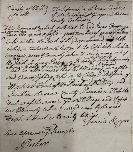 However abhorrent it is to us today, cockfighting was once extremely popular. It generally took place in inns where the urban and rural élites could gather to watch – one example was in the spring of 1743, when the Bell Inn in Gloucester advertised an inter-county cockfight between Shropshire and Monmouthshire. Many places had public cockpits, but private houses could also be used – an example being Yew Tree House in Painswick, where illegal cock fights were held in its cellar. Cockfights were popular on holidays and feast days especially Shrovetide - the last chance for good food and unrestricted ‘fun’ before the long period of lent. Most archives pertaining to cockfighting relate to the theft of birds, such as this example in the Gloucestershire Quarter Sessions – a deposition made by Dennis Rogers of St. George's (Bristol), coal miner, concerning the suspected theft of fighting cocks by Hezekiah Hunt of St. Philip & Jacob (Bristol), shoemaker, heard by Justice N Tooker on 19 June 1760. Rogers swore that over the previous year, he’d had around 20 cocks stolen – valued at 5s a bird or £5 in total (roughly £42 today) and that he’d subsequently found them at a cock fight in Hunt’s possession.