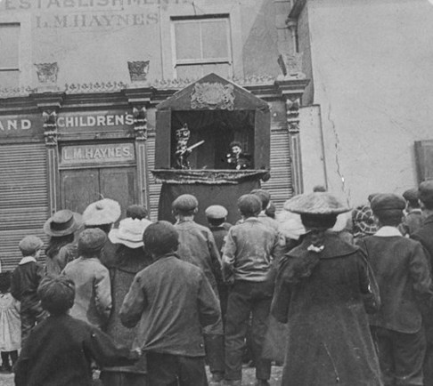 The Punch and Judy show has roots in Italian commedia dell'arte of the 1500s – professional comedy theatre, often performed on the streets. Mr Punch is derived from the stock character Pulcinella – anglicised to Punchinello and is a variation on the Lord of Misrule/Boy Bishop. Punch & Judy began became popular during the Restoration, when art and theatre reemerged after the years of puritan rule. Originally, they were marionettes, but were reinvented as glove puppets to cope with the violent action without the obstruction of marionette strings. The show was originally for adults, but it changed into a children's entertainment in the late Victorian era – as can be seen in this show at Stroud around 1900. One reason for the change was that other members of the show's cast – the Devil, the hangman and Punch's mistress ‘Pretty Polly’ – were seen as inappropriate for young audiences!