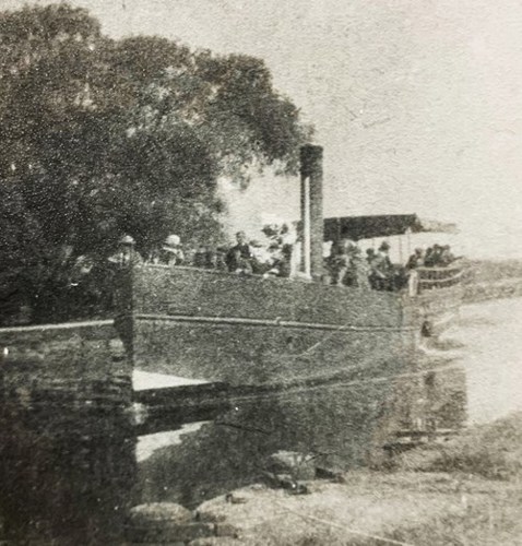 Pleasure cruises on rivers and canals have been popular since the early days of steamboats. Regular trips went from Gloucester to Wainlodes and Tewkesbury on the Severn and on the Gloucester-Sharpness Canal, from Gloucester to Saul and Sharpness, calling at places enroute such as Saul Junction, Frampton and Purton. This is the steamer S.S. Wave on the Gloucester-Sharpness Canal c.1905.