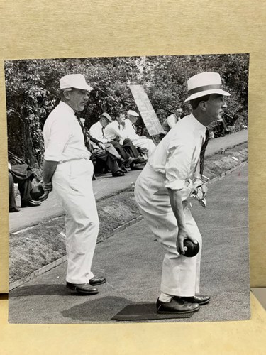 This photograph was taken at the Gloucester Bowls Tournament played at Gloucester's The Spa ground in 1959. Popular from the 1400s onwards, bowls can be played on either flat greens or crown greens (which have a raised centre). The two versions arose due to the bowling greens – wealthy players with large gardens made bowling greens on flat lawns, while the less affluent played on rougher common ground and parks close to inns and taverns, which became the forerunners of the crown greens. There were several bowling greens in Gloucester and Cheltenham from the 1700s onwards.