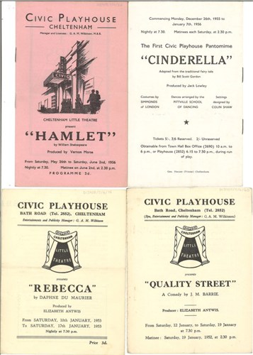 In ‘Shakespeare in Love’, Mr Henslowe says that “The natural condition of the theatre business is one of insurmountable obstacles on the road to imminent disaster” but despite this view, theatre has been popular since Tudor times. In Gloucester, the city’s Boothall was used by visiting companies of players for concerts, plays, and performances from the mid-1500s onwards. Apart from a decline under the Puritan regime, theatre remained popular and most towns (and many villages) had ‘AmDram’ companies by the early 1900s in various theatres and village halls. These are programmes for Cheltenham’s Civic Playhouse and are among many such programmes that the archives have from other theatres and companies.