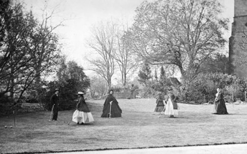 Introduced from France at the Restoration, croquet became highly popular as a social pastime for both sexes in the mid-Victorian period – one reason may be that Budding invented his lawn-mower around the same time, making creating flat pitches easier. In 1868, the first official croquet all-comers tournament was held at Moreton-in-Marsh – the same year that the All-England Croquet Club was formed at Wimbledon, London. This is the croquet lawn at Kemerton Upper Court in 1861– looking at the undulations it’s safe to say it looks quite challenging!