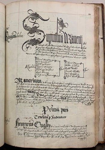 There were once 2 manors in Kingsholm; Tuwell Manor, which was owned by St. Oswald’s Priory, and Kingsholm Manor, which was held by the king (via King’s Barton Manor). No records have survived for Tulwell Manor (which by the 1770s had shrunk to a small farm rented by the Dean of Gloucester), but records have survived for Kingsholm Manor, largely because it became part of the estate of Sir William Cooke of Highnam Court. This rather artistic page is the preamble of a survey of the manor in 1607, written in Latin as were all manorial records prior to 1733.