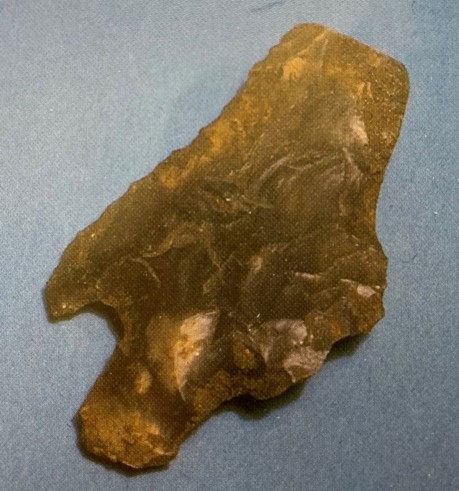 An insight into the prehistory of the Kingsholm area is this barbed and tanged flint arrowhead. It was found in 1987 during archaeological excavations ahead of the building of the Richard Cound BMW car dealership on the corner of Kingsholm Road and Denmark Road. It dates from the Bronze Age, around 4000 years ago, and has a broken tip and barb, so was probably lost in a hunting expedition. It is currently the oldest archaeological find in Kingsholm.