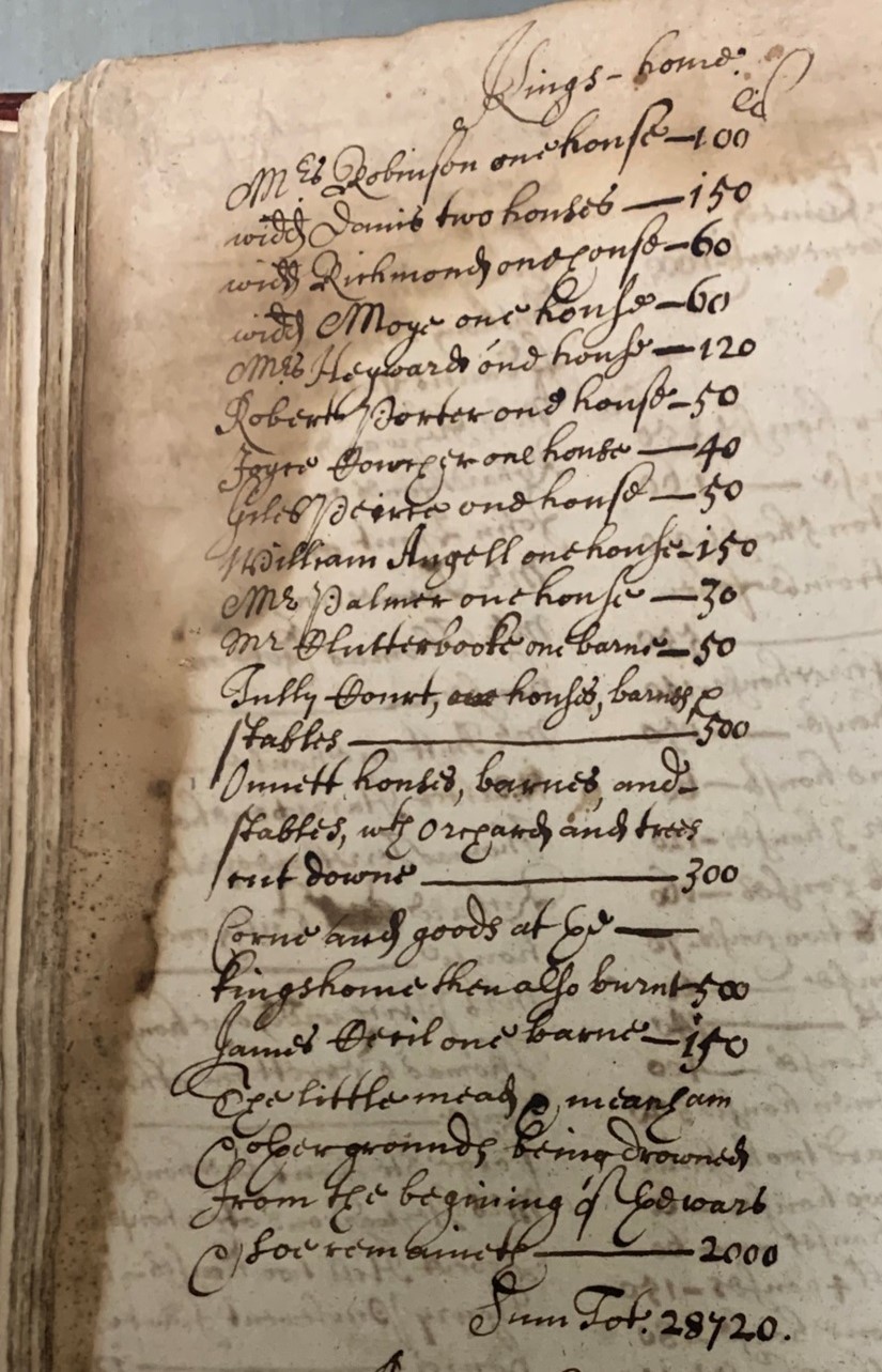 In 1646, at the end of the First Civil War, the City Council undertook a Grand Inquest to determine the financial impact of the war on the city. The Mayor and Aldermen all agreed that in order to save the city from being taken by the King in the siege, the Governor and Council of War had no option but to destroy the suburbs and to flood the meadows on the north and north-west sides of the city. The inquest calculated that the overall losses that the city sustained came to £28,760 (just under £3 million today), but that other inhabitants suffered losses over that and ‘are in much want and misery'. This image, taken from the borough’s Order & Letter book, details the losses that occurred in Kingsholm, which amounted to 12 houses, 3 barns, 2 stables being destroyed or burnt plus orchards and trees being cut down and crops in barns being destroyed. While the cost of this was estimated to be £2,310, the damage to the fields – ‘for grounds being drowned’ – was put at £2,000, bringing the total for Kingsholm to £4,310 (about £446k today).