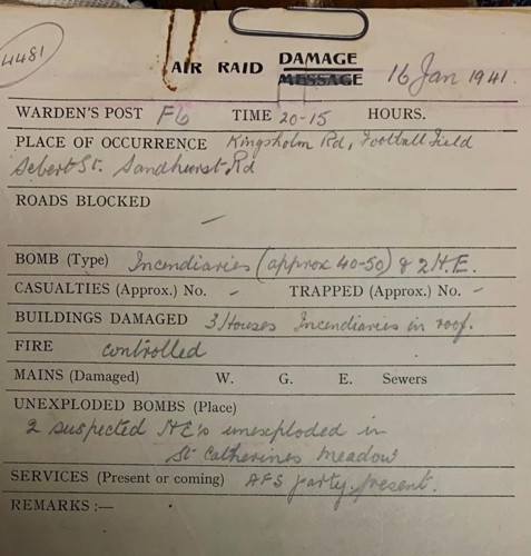 The Air Raid Precautions (ARP) had 2 posts in Kingsholm. This image, from ‘Post 6F’ – but listed as ‘F6’ – is an air raid damage report recording 40-50 incendiary bombs and 2 high explosive (H.E.) bombs that fell at 20.15 hours on 16th Jan 1941 on Kingsholm Road, Gloucester Rugby, Sebert Street and Sandhurst Road. The pair of unexploded bombs had fallen on St. Catherine’s Meadow and these would have been dealt with by the Army UXB squads. Given the date, we know that the bombs were dropped by stray Luftwaffe bombers from a Bristol raid. The log books not only record air raids (usually noting down the Air raid Yellow, Red and All Clear times) but also training exercises and maintenance schedules.