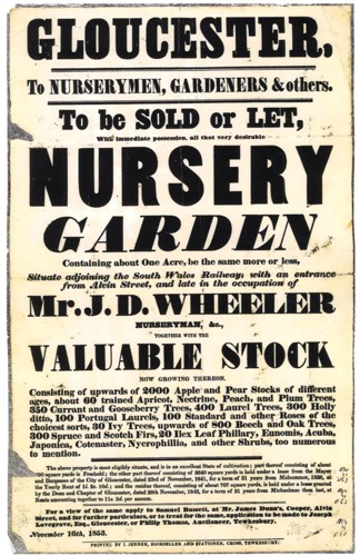 Gloucester's growing population provided a ready market for produce and the rich, easy draining soils allowed for extensive market and nursery gardens to be established in the suburbs. The most well-known was that belonging to James Daniel Wheeler, who inherited his father’s business and had a nursery on Alvin Street (now Gloucestershire Heritage Hub). He was one of several Wheelers who were nurserymen and market gardeners and although space precludes a full account of the family and their businesses, a good introduction to the family and other gardeners can be found in Gloucester Gardeners 1650–1763 by Jan Broadway (Transactions of the Bristol & Gloucestershire Archaeological Society No. 131 (2013) – available to be viewed online at https://www.bgas.org.uk/resources/bgas-resources/search-past-transactions). The main unifying theme however was that as time passed, pressure on the nurseries increased as demand for land (for housing, roads and the railway) in Kingsholm grew and, one by one, as the area was developed, the nurseries (and allotments) closed.
