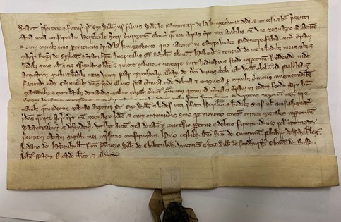 This grant, from Egeas the Fisher, burgess of Gloucester, and his wife Alice, to Richard of Chiltenham, burgess of Gloucester, is for 2s of annual rent that Egeas and Alice customarily paid to Richard. The grant is dated to about 1240 and shows an evolution of the name Kingsholm, from ‘Chingeshame’ to something more recognisable to us today – ‘Kingesham’, as it was witnessed by Hugh of Kingesham, whose name and place can be seen towards the left of line 14 . Coincidentally, it also shows an ancestor of the author, Robert de Puteleye.