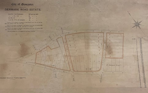 From the 1840s onwards Kingsholm underwent fairly rapid development – from 30 houses in 1801 to 363 by 1861. Working-class terraces sprung up north-east of Alvin Street, along Worcester Parade, St. Mark Street and Edwy Parade, while town houses and villas were built around newly formed Kingsholm Square. In the 1880s, Dean’s Walk and Dean’s Way were built and soon after several new roads were formed between Kingsholm and Wotton, allowing more housing to be built. In 1874 the city boundary was extended Kingsholm became a ward within the city, ostensibly to allow more improvements, especially to the sewage system. This 1902 plan shows the proposed development along Denmark Road with the numbered plots that were to be sold. Prices ranged from 4s 6d to 5s 6d per square yard (about £18 to £23) with individual lots ranging from not less than £400 to £900 (£31,000 to £70,500). The plots on the left hand side were eventually to become Denmark Road High School which opened on the site in 1909, having moved from its original location of Mynd House, which lay closer to the city centre.