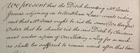 We present that the Ditch bounding Wm Wood’s ground adjoining on to Wallham Lane wants riding and that Wm Wood ought to rid the same. We therefore Order that he should rid the said Ditch by Christmas next under a pain of one shilling a lug for so much as shall be suffered to remain unrid after that time.