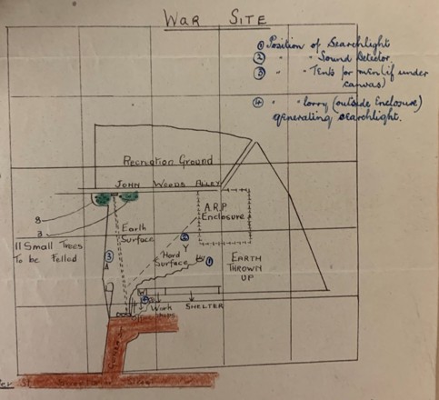 In February 1940, the Army requisitioned the Kingsholm recreation ground, initially for an AA battery, but this was changed to a searchlight. This plan shows the layout of the site which was fenced off to prevent public access (something the city council hadn’t realised would be the case). On-site, an air-raid shelter, 2 Nissen huts, a corrugated iron covered walkway, office and workshops were built together with a hard-standing for the actual searchlight (marked by the number ‘1’ on the plan). It was operated for the duration by the 68th Searchlight Regiment (1st Rifle Battalion, Monmouthshire Regiment). After the war, the Army returned the site to the City council, but only after they tried to sell the Nissen huts to the Council!