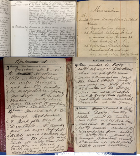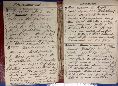 Originating from Thornbury, but from Isle of Mull stock, Hector Maclaine joined the Royal Horse Artillery and after time at the Royal Military College, he served as a 2nd Lieutenant during the Afghan Wars. His entries for 1876 here are written in an 1871 diary! This recalls a march from London (probably Woolwich) through St. Albans, Dunstable, and Rugby, then onto Nuneaton. Maclaine was a hunt follower and this page notes that they passed through ‘nice hunting country in Hertfordshire’ and five days later, the territory of the Atherstone Hunt.