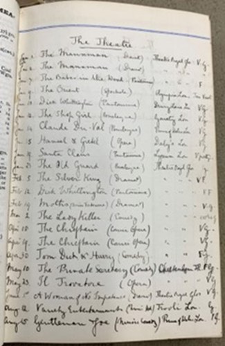 This is a page from the 1895 diary of John Wilton Haines of Hucclecote (1875-1960), a poet, botanist, and solicitor. He clearly enjoyed the theatre as this page lists the shows that he attended – a total of 22 in just seven months – in both Gloucester and London. He also had a broad taste for there are opera and theatre performances (of drama and comedy) as well as burlesque and pantomimes! The name of each show is given, as well as where it was being performed and his opinion of each. Most are given a ’VG’ or ‘VF’ (presumably ‘Very Good’ and ‘Very Funny’) and the only negative one was for ‘The Orient’ at London’s Olympia on 9 January. Haines described this as ‘Too vast’ and no wonder, for ‘The Orient’ was an aquatic extravaganza laid on in Olympia by Bolossy Kiralfy, one of the famous Kiralfy Brothers. These were a pair of showmen, performers, producers, writers, and creators of musical extravaganzas in the late 19th and early 20th centuries. With costumes alone costing over £20,000 and a cast that numbered around 2,500, ‘The Orient’, was Bolossy’s latest spectacular and opened on Boxing Day 1894. Despite record-breaking opening day attendance of 34,000 people, bad weather and a flu epidemic ultimately limited attendance, and the show was forced to close in July 1895