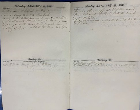 This is a page from the pocket diary of Thomas Grimston Bucknall Estcourt (1775-1853), of New Park, near Devizes, Wiltshire. He was the eldest son of Thomas Estcourt and was MP for Devizes 23 January 1805 – February 1826 and for Oxford University from 22 February 1826 – 1847. There are over 50 similar diaries and although there is a reasonable amount of space for daily entries, Estcourt has kept entries very short, with only brief mentions of family affairs, estate business and parliamentary matters, although he has included numerous references to shooting, hunting, and guests he entertained. Like many personal diaries, the handwriting here is not easy to read, as it tended to suffer from speed as the diarist wrote down what they considered of importance. The main items of interest in these four days is that he bought a draw horse from a Mr Wickham for £50 on Saturday 19, a hunt at Shipton Wood on Sunday 21 and the Hunt Ball at Devizes on Tuesday 22 January.