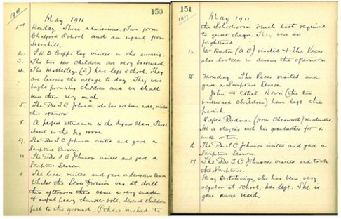 School logbooks are dairies that record the day to day events that took place at a school. This example from Ampney Crucis school, records events from the 1 May 1911 to the 17 May. It is a typical example, noting admissions of new pupils, departures of others, visits by the vicar to give scripture lessons (a very regular occurrence) and what was obviously a brief albeit terrific thunderstorm that terrified the pupils and even stunned some who fell to the ground.