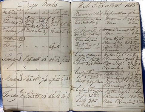 Among the archive of the Sotheron-Estcourt family of Shipton Moyne, are the papers of Admiral Frank Sotheron (1793-1835). He was born in 1765 and entered the naval service in 1776. He had an active naval life, seeing action in the Battles of Ushant, St. Vincent and several others. In the summer of 1803, Sotheron was appointed to the command of the 74-gun HMS Excellent, and it is from this time that this logbook belongs. It covers part of voyage from Portsmouth to Gibraltar, while Excellent was escorting an outward convoy bound to the Mediterranean. Such convoys needed protection not only from the French and Spanish navies, but also from the numerous foreign privateers that cruised the area. Covering six days from 29 September to 4 October, the logbook records the ship’s daily position – in latitude/longitude and in terms of the bearing to various places (i.e., The Needles, Start Point, The Lizard, Cape Ortegal and Cape Finisterre). The right-hand column details the quantities and usage of water and beer that the ship carried, which started at 205 and 10 tons respectively. On average the crew drink or used 1½ tons of water a day, while the beer consumption was more erratic, ranging from 2½ tons to 1 ton! Although these quantities might seem excessive, it’s important to remember that at this time the official complement of a 74-gun ship was 650 (typically 40 officers, 490 sailors and 120 marines). Although placed under the command of Vice-Admiral Lord Nelson, Excellent missed the Battle of Trafalgar, being stationed at Naples at the time. On 8 July 1805, Excellent departed the Mediterranean for home, and Sotheron left this ship shortly after. He never saw active service again, but was promoted rear-admiral on 1 August 1811, vice-admiral on 12 August 1819, and admiral on 22 July 1830. He died in February 1839, outlasting the Excellent, which was broken up in 1835.
