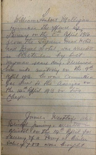 This is a page from the diary of Detective-Sergeant Frank Hallett, who was based at Gloucester. It has two entries, one for receiving into custody William Milligan, who been arrested by Detective Wayman in Cheltenham on 9 April 1916. Milligan was accused of larceny (the unlawful taking or theft of the personal property of another person or business) from the Saracen’s Head Hotel and Royal Hotel on 8 April and was remanded into custody for trial at the assizes. The second entry was for James Westlake alias ‘Bristol Jimmy’ who was arrested in Bristol for larceny of a pony worth £7.