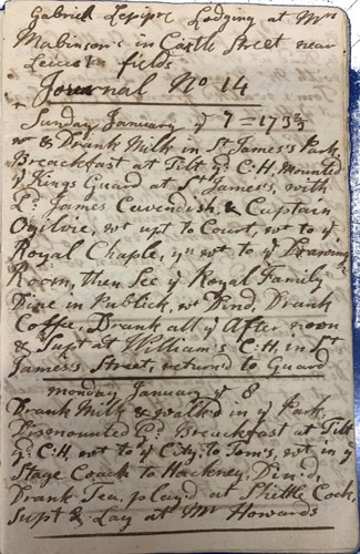 This is the front page from ‘Journal No.14’, one of the diaries of Gabriel Lepipre of London, which is contained within the archive of the Blathwayt family of Dyrham. Lepipre was an army officer, probably in the Scots Guards. Born in 1705 to Peter Lepipre and Sarah Roberts, he married Elizabeth Clark (possibly at Chelsea) but died in July 1754 in Grosvenor Square, London. In 1758, his widow married William Blathwayt, which is why Gloucestershire Archives holds Lepipre’s diaries. Despite the diaries being an incomplete series, they make for fascinating reading, containing entries relating not only to military duties, but also the life of a man-about-Town. In his off-duty time, Lepipre visited clubs, went to plays and enjoyed gambling in London. The diaries are full of interesting nuggets of information – on this page for instance, for the 7 January, he records drinking milk in St. James’ Park (which reminds us that at this time cows were grazed there and were milked by local milkmaids who sold the milk). He also writes about seeing ‘the Royal Family dine in publick’, which appears to have become a ‘drinking session’ for he writes that after seeing the Royals he ‘drank all afternoon’!