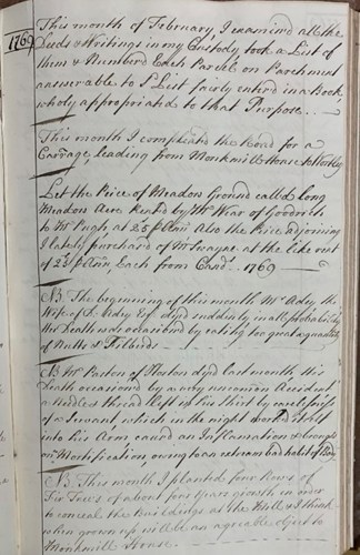 This diary is more of a ‘month to view’ rather than a daily diary. It came to the archives as part of the collection of John Letal of Tetbury, a solicitor of Wotton-Under-Edge. We know little about the author, John Osborne, other than what is contained within this diary. He lived at Monk's Mill House near Wotton-under-Edge but also owned property at Goodrich in Herefordshire. Osborne entitled this diary ‘Observations on the many trivial, as well as material, occurrences of my life, committed to writing mainly for the assistance of my memory being by no means so good as I could wish and may be of some advantage to those that succeed me.’ The diary rarely months or dates, but generally devotes a page to a month – the page here is for February 1769. In this month, Osborne records that he listed and numbered his property deeds, let a piece of land called Long Meadow and purchased an adjoining piece of land, completed a road at Monks Mill and put in a hedge of fir trees to hide the unsightly mill buildings below his house. He also recording two unusual deaths. The first was that Mrs. Adey died "by eating too great a quantity of Nutts & Filberds" (filberds or filberts being an old name for hazelnuts). A rather scarier death was that of Mr Paston of Horton, who died by "a needle thread left in his shirt by carelesness of a servant, which in the night work'd itself into his Arm, caused an Inflamation and brought on a Mortification, owing to an extream bad habit of Body".