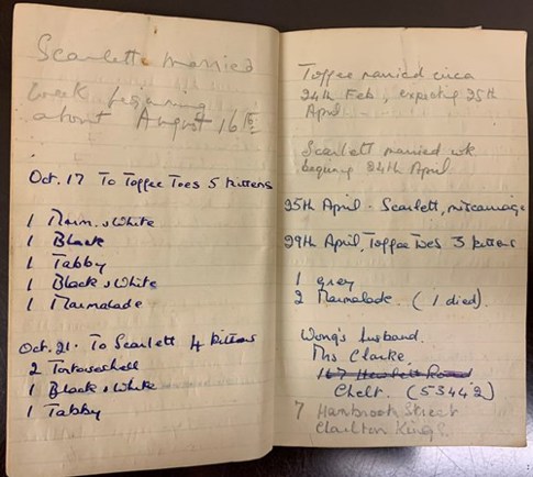 John Cecil Moore (10 November 1907 – 27 July 1967) was a best-selling British writer and pioneer conservationist, famous for his best-selling trilogy of books, published in the years immediately after the Second World War – Portrait of Elmbury, Brensham Village and The Blue Field. In the Second World War, he served as a carrier-based pilot in the Fleet Air Arm and it was whilst serving, he happened to meet Lucile Douglas Stephens, a daughter of noted Australian paediatrician, Henry Douglas Stephens and they married on 1 April 1944. After the war, the couple moved to Kemerton Village, near Bredon outside Tewkesbury, living firstly at Kemerton Lodge (now Chapel House) before moving to Lower Mill Farm in 1961. Surrounded by a stream, with a stable block and ample land for horses, Lower Mill Farm allowed for a relaxed country lifestyle and the couple indulged in countryside passions such as fishing, bird watching and hunting, whilst keeping and breeding ducks, horses, and cats, all of which they recorded in animal diaries. This is a page from one of Lucille’s cat diaries and includes details of the cats with information concerning kitten births, wormings, marriages and deaths. Quite what a cat ‘marriage’ was isn’t known for certain but was probably when cats were caught mating!