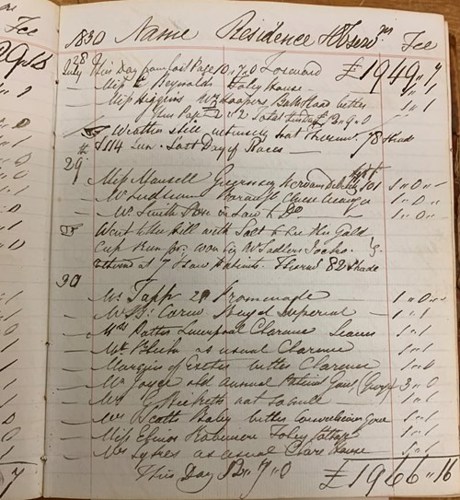 Dr Henry Charles Boisragon came from a family of French aristocrats that had both military and landed connections. Born in 1778, he spent his early years in Ireland before entering Edinburgh University in 1795. He qualified M.D. in 1799 and lived in London but in 1805 he moved to Bath, where he opened a practice. However, by this time Bath’s popularity with the elite was declining and so in 1807 Boisragon moved to Cheltenham, which was growing in reputation as a fashionable spa town. Initially based in Winchcomb Street, in 1811 he moved onto Royal Crescent, close to where Dr. Edward Jenner and Dr. T. Howell (surgeon extraordinary to the king) conducted their practices. He then proceeded to build a large and lucrative practice that lasted over 40 years; during which he became an extra physician to the Prince of Wales (later George IV) and treated celebrities such as Princess Esterhazy and Lord Byron. He was also involved with establishing Cheltenham’s General Hospital and Dispensary, the town’s Philosophical & Literary Institution and helped promote and establish the spa as a medical centre for treating ailments. After retiring he resided for some years in Paris and was a friend of King Louis Philippe before he died in 1852, aged 74. His professional diary featured here contains details of patients visited, accounts, and observations on the singing career of his son Conrad (whose professional name was Conrad Borani). Medicine was very lucrative at this time and the figure given on this page here, £1,966 16s is around £133,300 today. Sadly, like most medical writers, his handwriting is bordering on atrocious! The clearest entry here (in the middle of the page) isn’t medical - it is an account of his going to see the racing. ‘Went to the hill with Salt to see the Gold Cup run for; won by Mr Sadler’s Jocko. Attended at 7 and saw patients. Thermo 82° shade,’