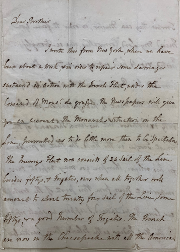 Initially the Royal Navy gave Britain the upper hand but when the French entered the war on the American side in 1778, the tables turned. The Battle of the Chesapeake was a naval battle fought in September 1781 between an outnumbered and outgunned Royal Navy fleet under Sir Thomas Graves, and a French fleet led by the Comte de Grasse. This is a letter written after the battle from Capt. Francis Reynolds, onboard HMS Monarch at New York, to his brother Lord Ducie, describing the action and that "the French are now in Chesapeake with all the American Troops they can Muster.” The battle was tactical draw, but a strategic British defeat as it stopped the navy from reinforcing or evacuating the besieged forces of Cornwallis at Yorktown – ultimately forcing his surrender, Britain losing the war and America gaining its independence.