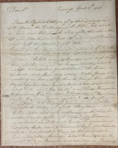 Among the Government forces who defeated the Jacobite rebels at Culloden was James Wolfe – who as a major general in 1759, gained posthumous fame for his victory over the French at the Battle of the Plains of Abraham in Quebec during The Severn Years War. When the 1745 Jacobite began, Wolfe was aide-de-camp to Henry Hawley, who temporarily replaced General Wade as commander of the Government forces in Scotland prior to the arrival of the Duke of Cumberland. While on campaign Wolfe frequently wrote to his uncle, William Sotherton of Shipton Moyne and we are lucky enough to hold these letters as part of the Sotheron-Estcourt family archive. This page, written by Wolfe after Culloden is his eye-witness account of the victory. During the battle, Wolfe was stationed with the 4th (Barrell’s) Foot which took part in the fierce hand-to-hand fighting on the Government’s left wing.