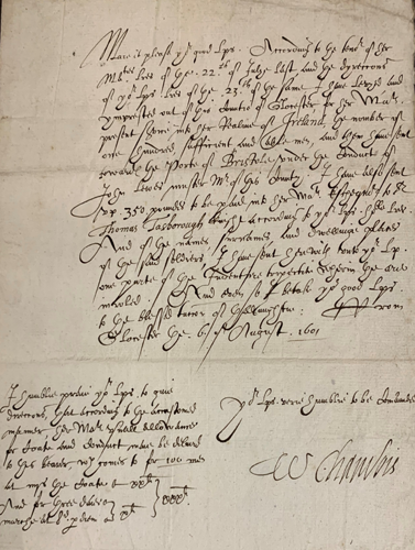 Also known as The Nine Years' War, this was fought in response to the ongoing Tudor conquest of Ireland by an Irish alliance under the O'Neills of Tyrone and the O'Donnells of Tyrconnell. As with previous Tudor rebellions, the county’s involvement was supplying men to serve in the English army. On the 6 August 1601, Baron Chandos of Sudeley wrote this letter to the Privy council informing them that he had “levied and impressed out of this County of Gloucester, for her Majestie's present service into her Realm of Ireland, the number of one hundred sufficient and able men, and them have sent towards the Port of Bristol under the conduct of John Lewes muster Master of this County”. He had also “sent up 350 pounds to be paid into her Majestie's Exchequer“ as well as a list of the “names, surnames, and dwelling places of the said soldiers”. In the separate paragraph bottom left he then tactfully requested payment according to “her Majestie's usual allowance for Coat and Conduct, which comes to for 100 men at iiijs the Coat...£20. And for three days march at 8d per diem...£10 } £30”