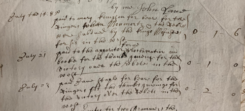 Also known as the Pitchfork Rebellion or the West Country rebellion, this was an attempt to depose James II, who succeeded his brother Charles II as king in February 1685. It was led by a group of dissident Protestants headed by James Scott; 1st Duke of Monmouth (the eldest illegitimate son of Charles II), who opposed James largely due to his Catholicism and who was exiled in the Dutch Republic. On 11 June 1685, Monmouth landed at Lyme Regis where he had widespread popular support and began a march on London, gathering an army of nonconformists, artisans and farm workers – including a certain Daniel Defoe. Things did not go to plan and by the 5 July, Monmouth was hemmed in around Bridgewater with a Royalist army in close proximity. To try and break out Monmouth decided to launch a night attack on the Royal army at Westonzoyland. The result was the Battle of Sedgemoor; the last pitched battle fought on English soil. The supposed surprise rebel attack failed, and the battle was a total Royal victory in which some 2,700 rebels were killed and 1,400 captured. Monmouth escaped but was caught a week later and executed at Tower Hill on 15 July – it took 5 or 7 strokes of the axe to sever his head. This entry in the Mickleton Churchwardens account show 3s 6d worth of beer (about £21) given to the bell ringers for ringing the church bells in celebration of the victory over the rebels. It also records a shilling paid to the diocesan apparitor (a church official) for a ‘proclamation and booke’ – presumably both containing the official form of words to celebrate the defeat of the rebels.
