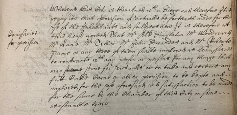 “Whereas this City is threatened with a siege and therefore it is requisite that provision of victuals be forthwith made for the use of the Inhabitants and Souldiers. It is therefore agreed that Mr Ald. Singleton, Mr Woodward, Mr Lane, Mr Tither, Mr John Edwardes and Mr Roberts shall be employed as Commissaries to contract any person or persons for any things that may prove for victuals or to take and receive any fatt cattle, corne, or other provision….”