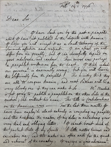 Letter from the nonconformist minister Dr. Price to Dr. William Adams, Master of Pembroke College, Oxford, 14 February 1776