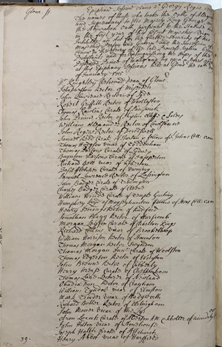 Oaths of allegiance were not new – the first was made to King Edgar c959. By 1700 there were two oaths – allegiance (declaration of fidelity to the Sovereign) and supremacy (repudiation of the spiritual or ecclesiastical authority of any foreign prince, person or prelate) – but in 1702, an oath of abjuration, which repudiated the right and title of descendants of James II to the throne was added. After the Jacobite Rebellion of 1715, nobles, MPs, peers and clergy were ‘invited’ to retake the ‘Oaths of Allegiance and Supremacy to His Majesty King George and the Abjuration Oath, pursuant to the statute Intitled "An Act for the further Security of His Majesty's Person and Government, etc’. The county Quarter Sessions Order Books record the signatories over 4 pages at Epiphany (Jan) and Michaelmas (Sept).