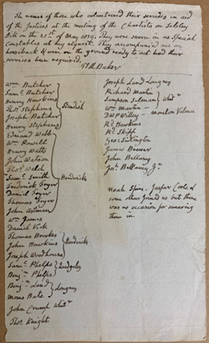 List of those who went to a meeting of Chartists on Selsley Hill with Thomas John Lloyd Baker as volunteers, serving as mounted special constables, 21 May 1839